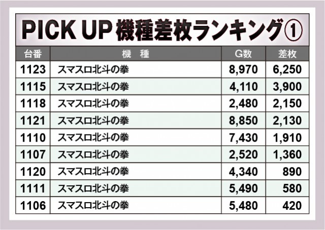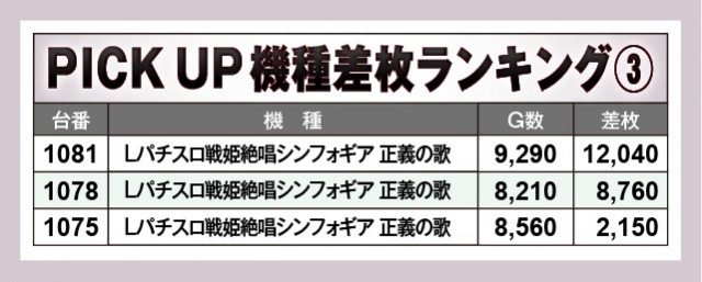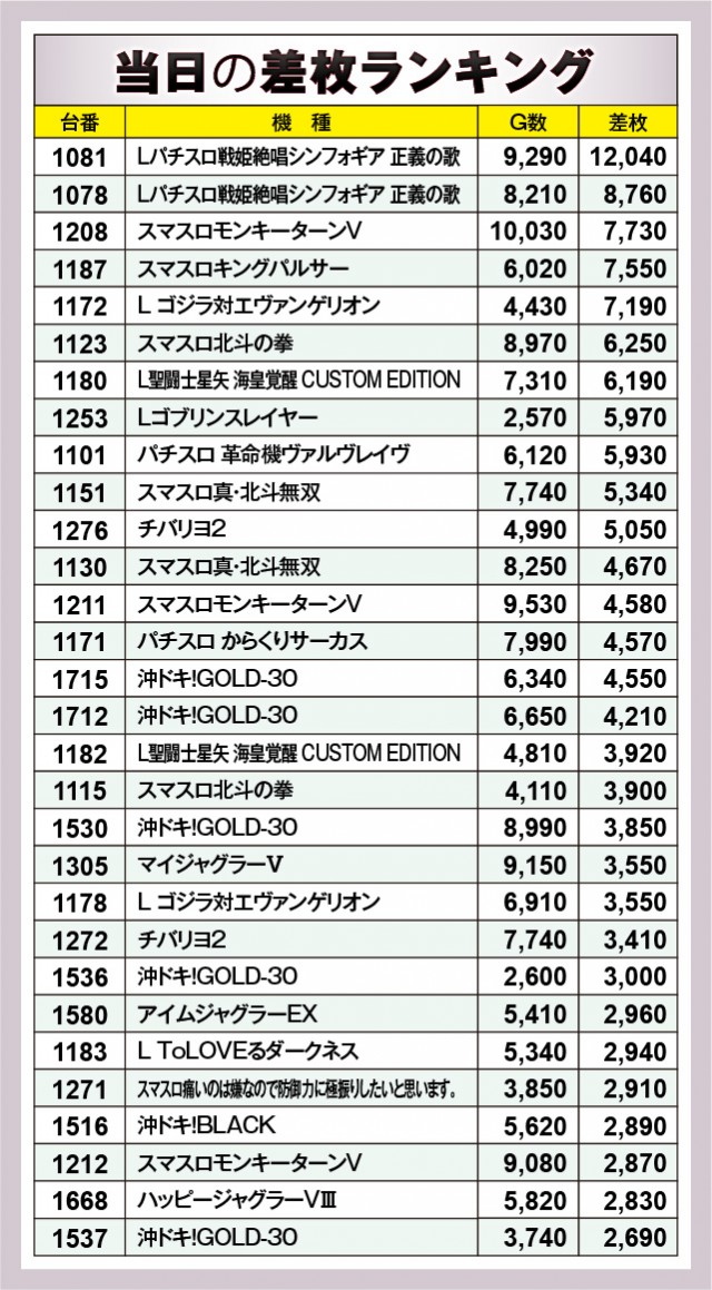 『スマスロ北斗の拳』『スマスロモンキーターンV』『Lパチスロ戦姫絶唱シンフォギア 正義の歌』の3機種は、いずれも全台がプラス差枚数を達成している。じっくりと打ち込まれた形跡も確認でき、ファンは相当な手応えを感じていたのは間違いない。回転数と差枚数が比例する展開が見られ、早々に好感触を得たファンも少なくないのではないだろうか。