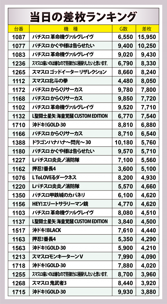 万枚オーバーは2台、トップ30台および特選9機種が残した差枚数はクオリティが高く、オープン前の並び人数の多さにも納得がいった。
