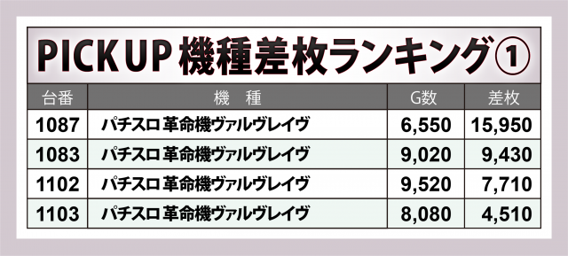 +16,000枚弱と全353台の頂点に輝く1087番台を輩出したのが『パチスロ 革命機ヴァルヴレイヴ』で、+9,400枚超・+7,700枚超・+4,500枚超が1台ずつと、大きな盛り上がりを誇った。