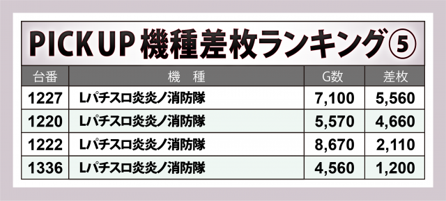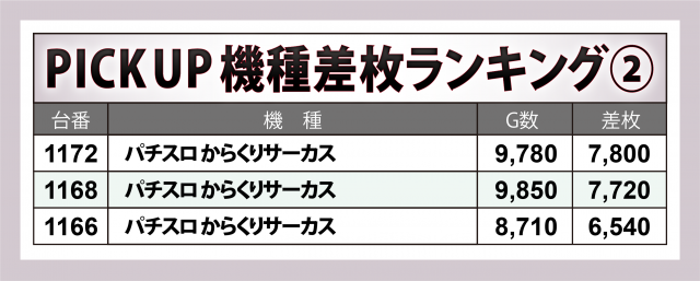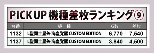 その他では『スマスロ ゴッドイーター リザレクション』に+8,200枚超・+3,300枚超が1台ずつ、『スマスロ北斗の拳』に+8,100枚弱・+3,500枚超が1台ずつ、『パチスロ からくりサーカス』に+7,500枚超×2・+6,500枚超×1、『L聖闘士星矢 海皇覚醒 CUSTOM EDITION』に+7,500枚超・+4,500枚超が1台ずつ、『ドラゴンハナハナ~閃光~ 30』の+5,800枚弱、『Lパチスロ炎炎ノ消防隊』に+5,600枚弱・+4,700枚弱が1台ずつと、ビッグヒットが連発。