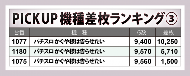 『ヴヴヴ』に負けずプラス5桁の台が生じたのが『パチスロ かぐや様は告らせたい』。他にも+5,700枚超の台が追随。