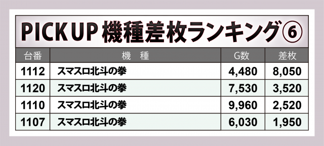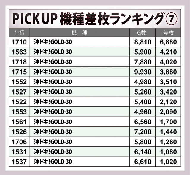 好調台の多さでは『沖ドキ!GOLD-30』が上2機種に勝った。上位6台は+6,900枚弱×1・+4,000枚超×2・+3,000枚超×3とハイレベル。