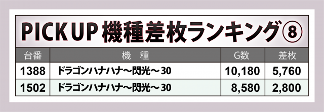 最初は優秀30台の成績から。この日はなんと30台の全てが+3,800枚以上の数値を果たし、+4,000枚以上は全体の9割強となる27台、+5,000枚以上は全体の半数超となる16台、+6,000枚オーバーは12台、+7,000枚オーバーは10台、+8,000枚オーバーは6台、+9,000枚オーバーは3台、そして万枚をクリアしたのは2台と、歴代回を上回る高水準となった。