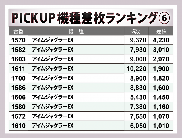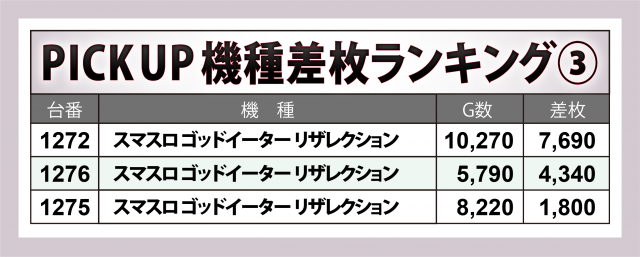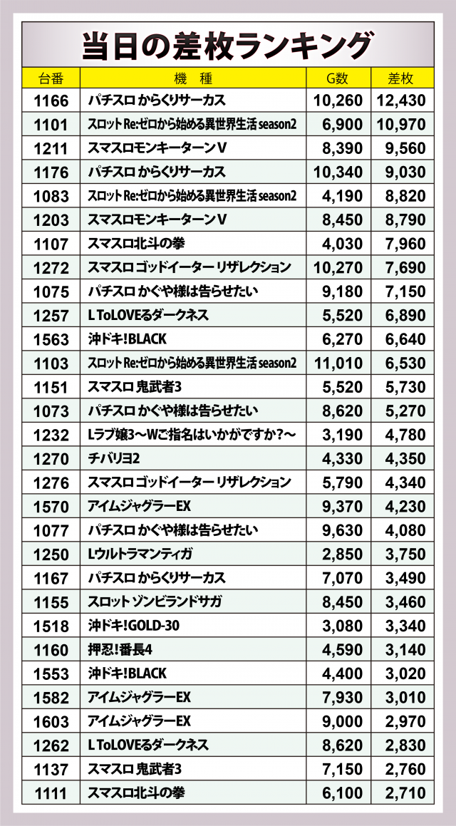 最初は優秀30台の数値に密着。ここ数回と同じく30台の全てが+2,000枚以上をマークし、+3,000枚以上は全体の9割弱となる26台、+4,000枚以上は全体の3分の2弱となる19台、+5,000枚オーバーは全体の半数弱となる14台、+6,000枚オーバーは12台、+7,000枚オーバーは9台、+8,000枚オーバーは6台、+9,000枚オーバーは4台、そして万枚をクリアしたのは2台と、クオリティは過去回に引けを取らない出来となった。