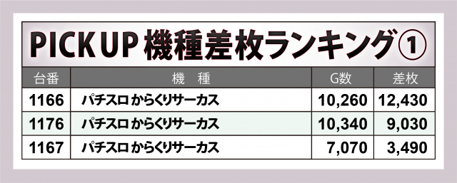 全353台の王座に君臨したのが 『パチスロ からくりサーカス』1166番台の+12,400枚超。さらに+9,000枚超・+3,500枚弱が1台ずつと、重量級の出玉が並んだ。