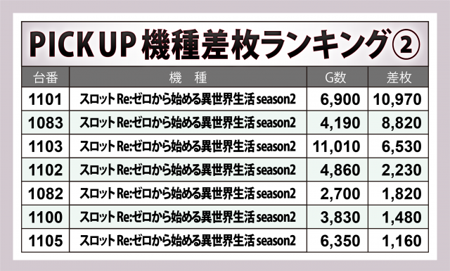 『スロット Re:ゼロから始める異世界生活 season2』も負けていない。+11,000枚弱を皮切りに+8,800枚超・+6,500枚超・+2,200枚超が1台ずつとなった上、他3台も4桁プラスを計上。