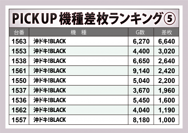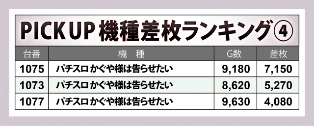 さらに『スマスロ ゴッドイーター リザレクション』では+7,700枚弱・+4,300枚超が1台ずつ、『パチスロ かぐや様は告らせたい』では+7,200枚弱・+5,300枚弱・+4,100枚弱が1台ずつ、『沖ドキ!BLACK』では+6,600枚超・+3,000枚超が1台ずつ&+2,000枚超が3台、『アイムジャグラーEX』に+4,200枚超が1台&+3,000枚クラスが2台と、同店の好成績常連機種が安定の成果を導いた。