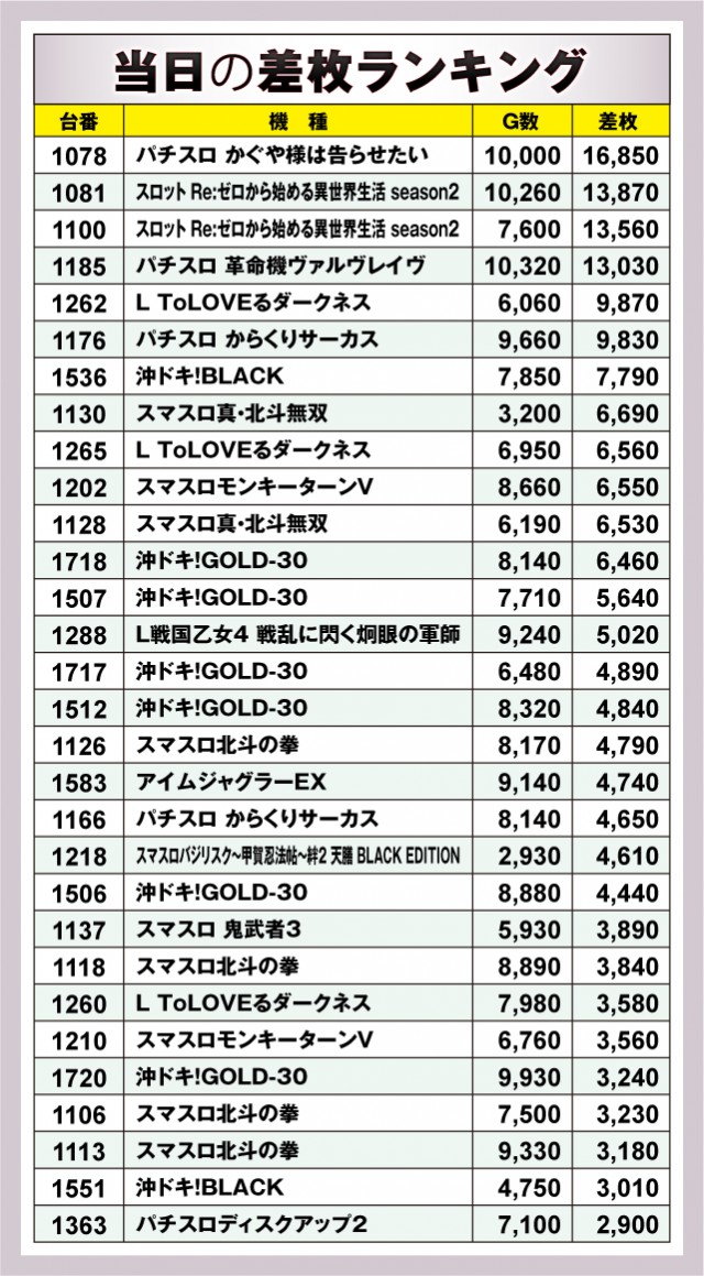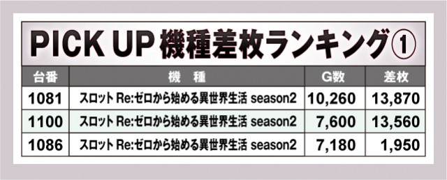 トップ差枚台は『パチスロ かぐや様は告らせたい』の1078番台。コンプリート手前の16,850枚という超優秀台となった。2番手から4番手は拮抗しているが、今話題の『スロット Re:ゼロから始める異世界生活 season2』は2台あって、1081番台からは13,870枚、1100番台からは13,560枚となっている。