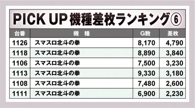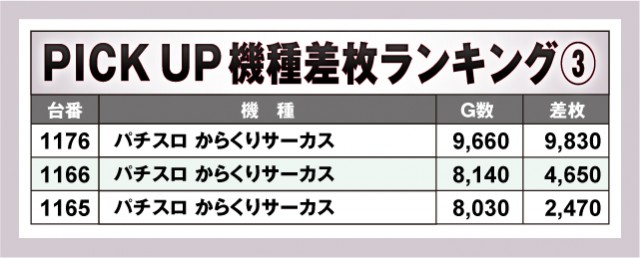 コチラはピックアップのコーナー。機種別にプラス差枚数になった台をご紹介している。