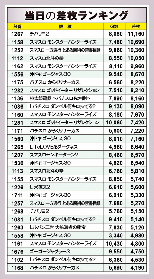 『チバリヨ2』『スマスロ 一方通行 とある魔術の禁書目録』『スマスロ北斗の拳』にて万枚OVERが飛び出し、当日の館内の盛り上がりを大きく引き上げていた。『スマスロ モンスターハンターライズ』は万枚達成のみならず、万枚未遂の台も確認できるなど、相当なポテンシャルを秘めていたのは間違いない。また差枚数のみならず、回転数も高い数字を記録していることから、打ち込める環境が整っていたのも確かだ。