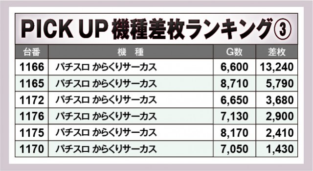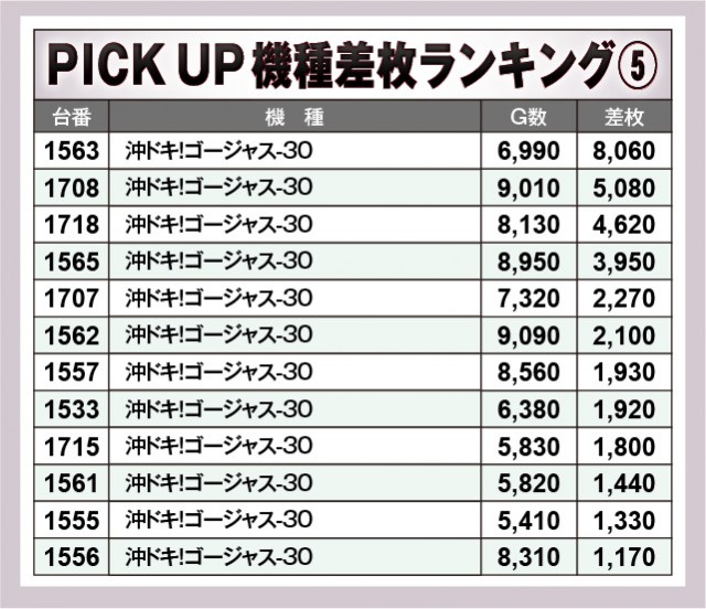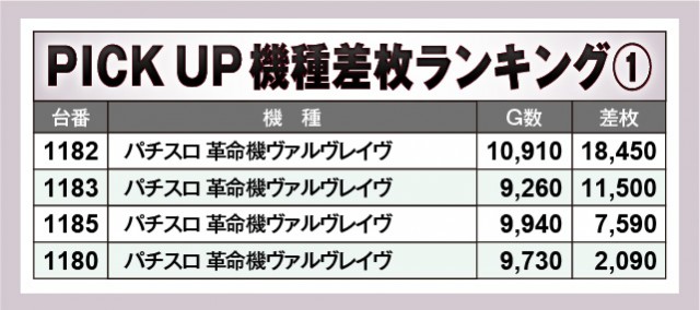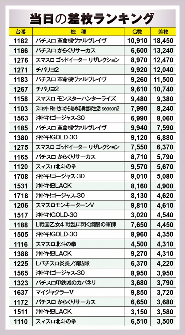 『パチスロ 革命機ヴァルヴレイヴ』『スマスロ ゴッドイーター リザレクション』『パチスロ からくりサーカス』はそのポテンシャルを存分に発揮し、万枚OVERを量産しているのが鮮烈だ。加えて『チバリヨ2』も同等以上の活躍を披露し、『沖ドキ!ゴージャス-30』も大台突破台が目立つ結果となっている。高い熱量を放つ一方、『マイジャグラーⅤ』では回転数と差枚数が比例する内容となっており、明らかな好感触にファンは口角を緩めていたに違いない。