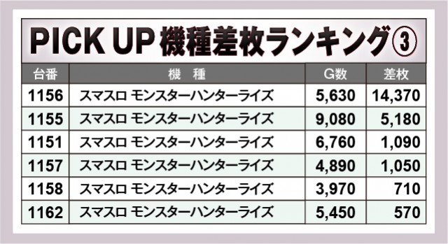 『スマスロ モンスターハンターライズ』『チバリヨ2』『パチスロ 革命機ヴァルヴレイヴ』『パチスロ かぐや様は告らせたい』から合計5台の万枚OVERが生まれ、店内の熱気を大きく引き上げていた。ほかにも7~8,000枚OVERなど大台突破台が多くなっており、ファンは右肩上がりに伸びる出玉を前に歓喜していたことだろう。また万回転OVERも確認でき、終日を通して打ち込まれた台が確認できるのも好感を覚えるポイントだ。