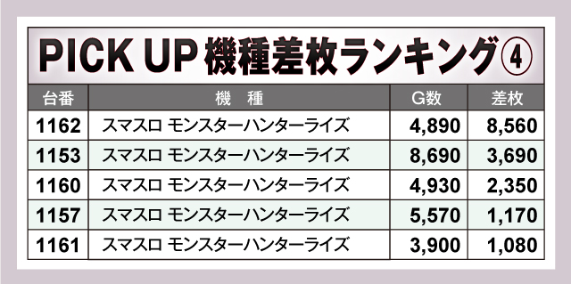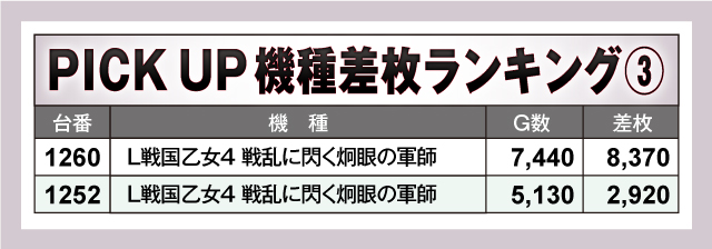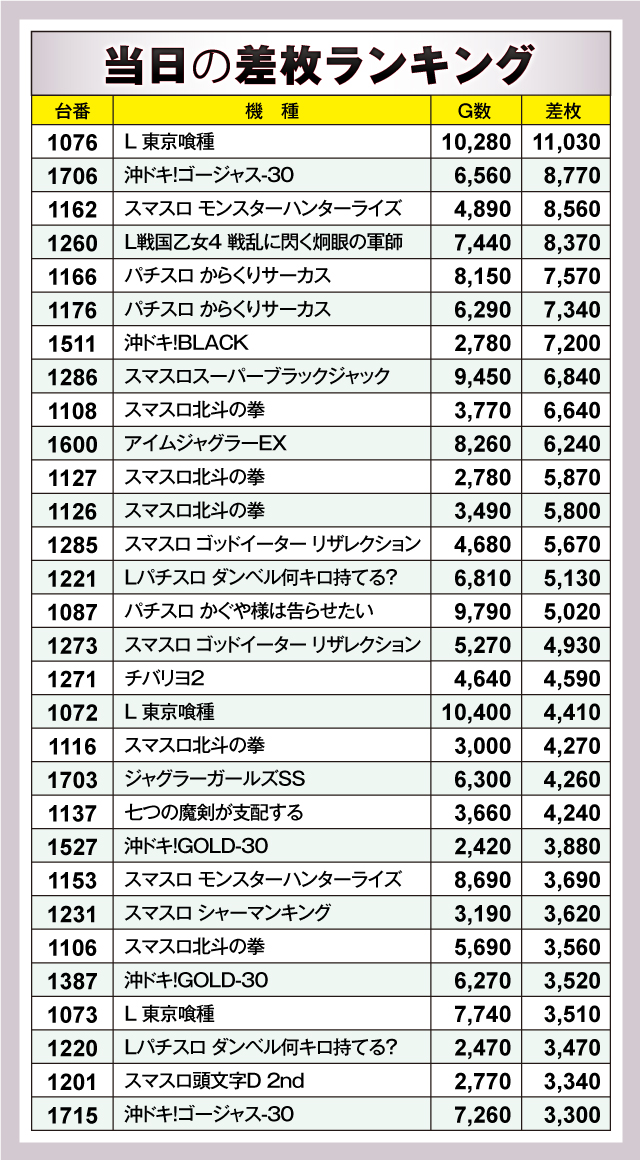 首位の座に輝いたのが『L 東京喰種』1076番台。+11,030枚で見事に万枚を達成している。つづく『沖ドキ!ゴージャス-30』1706番台は+8,770枚。『スマスロ モンスターハンターライズ』1162番台は+8,560枚。『L戦国乙女4 戦乱に閃く炯眼の軍師』1260番台は+8,370枚と、これらも十分な結果を叩きだした。