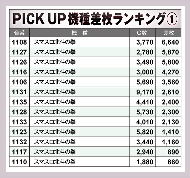 そのほか『パチスロ からくりサーカス』1166番台が+7,570枚、1176番台が+7,340枚。『沖ドキ!BLACK』1511番台が+7,200枚と3台が7,000枚オーバーだった。そして『スマスロスーパーブラックジャック』1286番台など3台が6,000枚オーバー。『スマスロ北斗の拳』1127番台など5台が5,000枚オーバーと、華々しいランキングができあがっている。