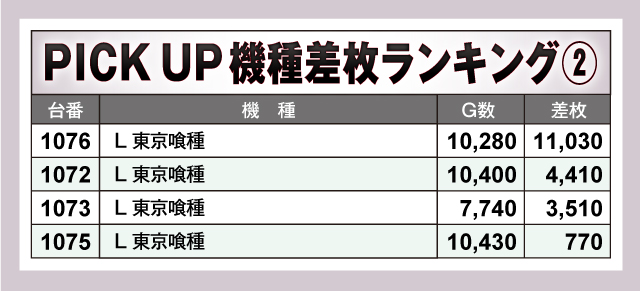 注目4機種をピックアップして見てみよう。いずれの機種もプラス差枚がズラリと並んでいて、たくさん回された台が総じて好結果を残しているのが見てとれる。そして特筆すべきはやはり『L 東京喰種』。万枚を突破した1076番台をはじめ、G数が10,000Gを超えている台が3台もうまれている。いま注目のマシンだけにファンの関心が高く、その期待に優秀台が応えた、ということだろう。