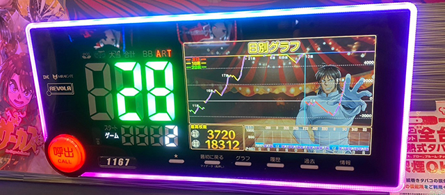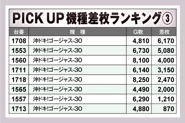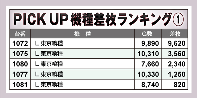 優秀機種を個別にチェックしていこう。『L 東京喰種』を見ると、いずれの台もトップクラスで高稼働。それにともない結果もついてきたようで、同店の力の入れ具合と人気ぶりがわかる。『スマスロ シャーマンキング』も万枚達成台ふくむ2台が、高稼働によりポテンシャルを引きだしている。『沖ドキ!ゴージャス-30』は台数が多めなもののいずれも立派なG数を記録していて、差枚も十分な好結果となっている。