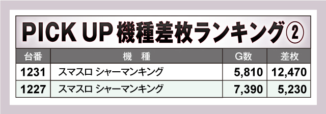 壮絶な差枚争いを制したのは『スマスロ シャーマンキング』。1231番台が+12,470枚と誰もがうらやむ結果を出し、首位に輝いた。おしくも2位となったのは『パチスロ からくりサーカス』1167番台。+10,060枚とこちらも万枚達成台でワンツーフィニッシュと相成った。