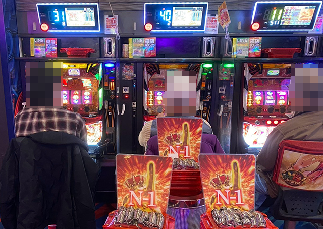 取材の時点で、1箱以上の持ち玉で遊技を楽しむプレイヤーの姿を確認。