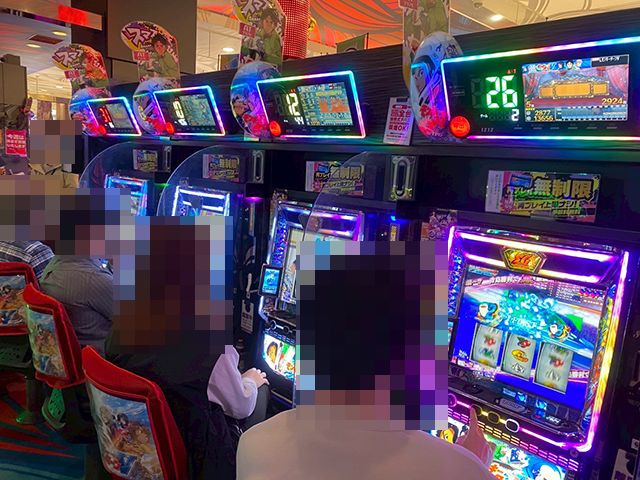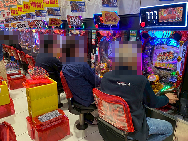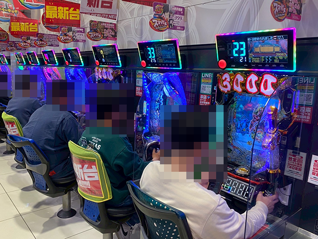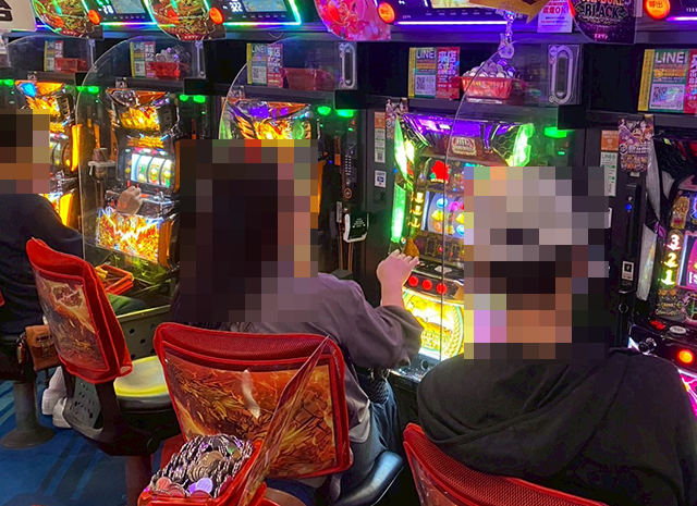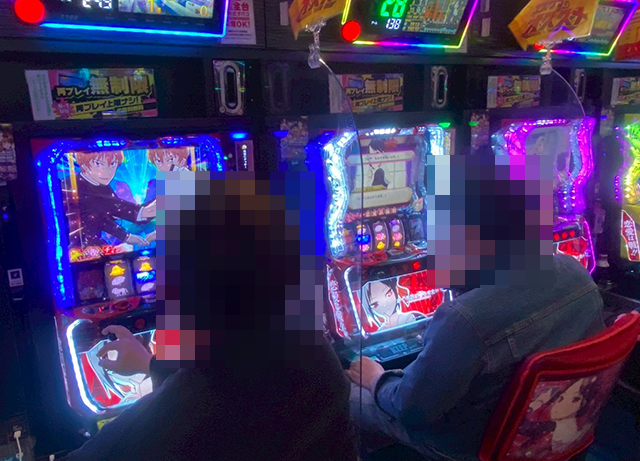 「沖ドキ!GOLD-30」と「ドラゴンハナハナ~閃光~ 30」にて、プレイヤーたちは持ち玉を使って遊技中。