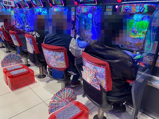 大箱3箱以上の持ち玉で遊技をおこなっている姿があった。