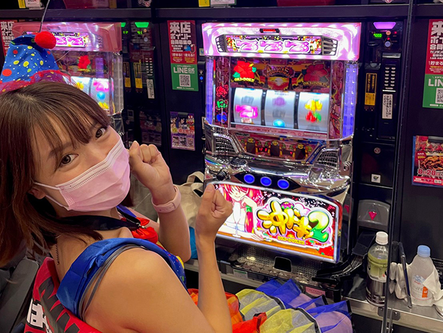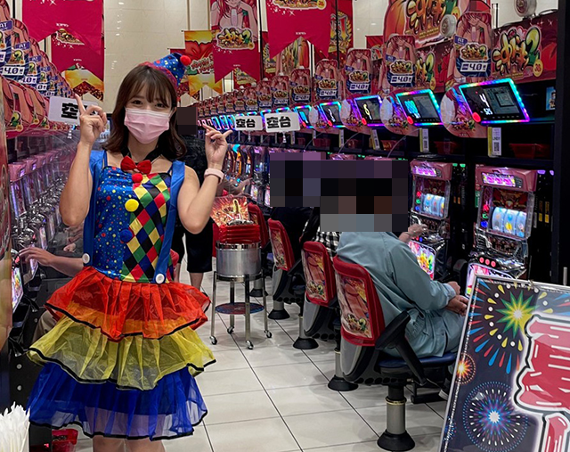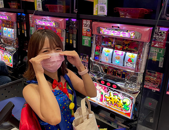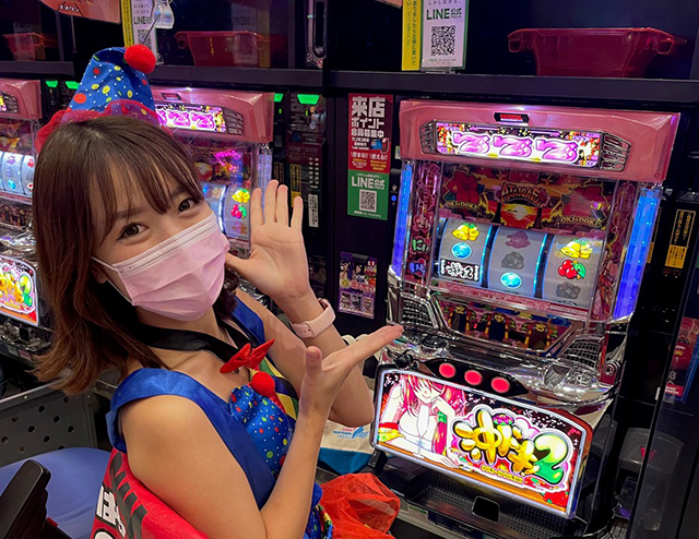 今回はカラフルなサーカス風のコスチュームに着替えて、パチスロの「沖ドキ!2-30」で実戦スタート!!