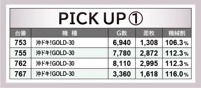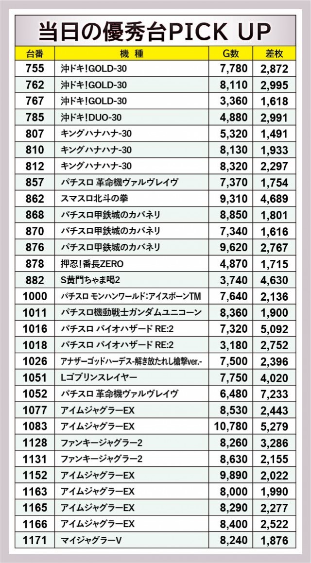 『沖ドキ!GOLD-30』『パチスロ甲鉄城のカバネリ』もまた、閉店まで打ち尽くされていた形跡が見られ、人気機種としてしっかりと責務を果たしたと言える。755番台+2,872枚や762番台+2,995枚、876番台+2,767枚など、コンスタントに大当りを射止めていたのも見逃せない。『アイムジャグラーEX』もまた、『ジャグラー』シリーズの盛り上がりを牽引する存在に。各台で力強くレバーが叩かれるばかりか、1083番台+5,279枚という大きな熱気を確認できたのは、周りで遊技するファンの自信を深めるきっかけになったはずだ。