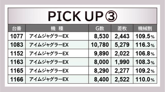 『パチスロ 革命機ヴァルヴレイヴ』1052番台+7,233枚という大きな熱気が放たれ、他の台も追随するように盛り上がりを見せていた。さらには『アイムジャグラーEX』1083番台10,780G・5,279枚も確認でき、特に『ジャグラー』シリーズは朝からじっくりと打ち込まれていたのが印象的だ。コンスタントな大当りによって出玉を右肩上がりに伸ばし、レバーに力が入っていたのは間違いない。