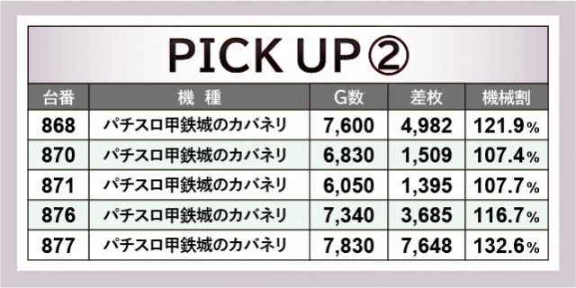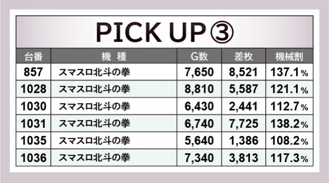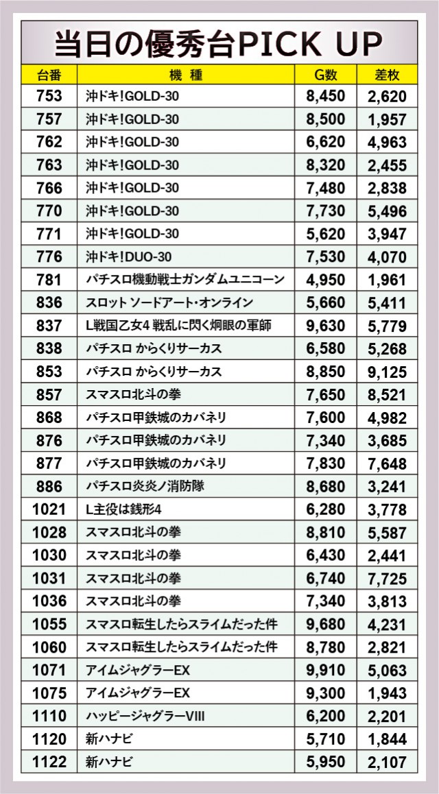 『沖ドキ!GOLD-30』では右肩上がりのグラフを描き、770番台+5,496枚という大きな熱量を披露。『パチスロ甲鉄城のカバネリ』もまた人気機種の筆頭として、877番台+7,648枚という記録を打ち立てた。それ以上に『スマスロ北斗の拳』の支持率は凄まじく、閉店まで活気が衰えずに1031番台+7,725枚という数字を残している。今後もこれら機種群が先陣に立ち、ファンに笑顔をもたらしてくれるのは必至だ。