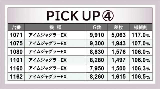 そして『アイムジャグラーEX』もまた、朝から閉店までじっくりと打ち込まれていた機種の1つである。1071番台+5,063枚という突出した熱気を放つほか、コンスタントなボーナス当選によって右肩上がりのグラフの形成。GOGOランプの輝きが眩しい光景を容易に想像できる内容で、ファンは充実のひと時を過ごしたのではないだろうか。