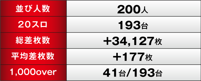 優秀台を筆頭に、全体的に好調な出玉を見せ、トータルの差枚数は+34,127枚、1,000over台も41台/193台を記録しており、待望の初勝利を鮮やかな快勝で飾った。これからも大いに期待できそうだ。