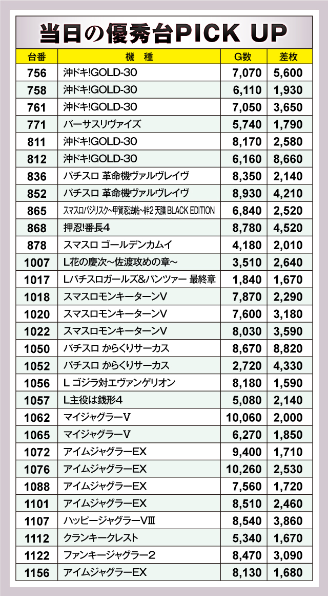 優秀台を見てみると、『パチスロ からくりサーカス』が素晴らしかった。1050番台が+8,820枚、1052番台が+4,330枚を記録。人気機種としての実力をアピールしている。僅差で続いたのが『沖ドキ!GOLD-30』で、812番台が+8,660枚をマーク。同機種は756番台が+5,600枚、761番台が+3,650枚、811番台が+2,580枚をマークしており、品全体が盛り上がっていた。以下、+4,520枚の『押忍!番長4』868番台、+4,210枚の『パチスロ 革命機ヴァルヴレイヴ』852番台、+3,860枚の『ハッピージャグラーⅧ』1107番台、+3,590枚の『スマスロモンキーターンV』1022番台と続いた。