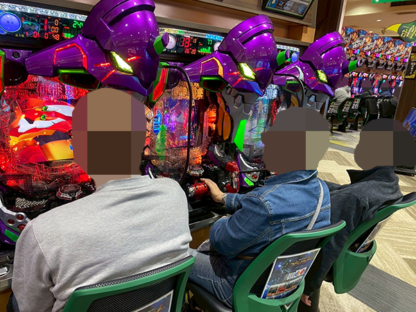 14時半ごろの4円パチンコでは「新世紀エヴァンゲリオン〜未来への咆哮〜」が盛況で、機種のポテンシャルをフルに活かすプレイヤーを確認している。