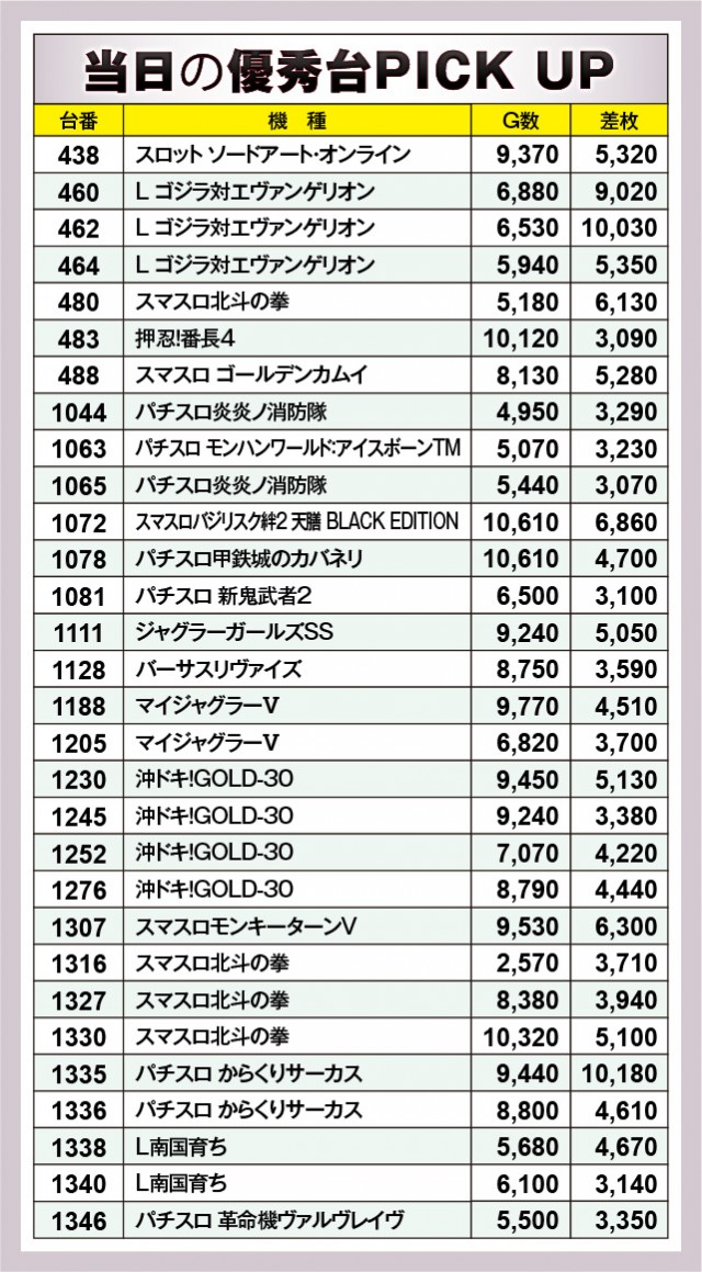 当日は2台の万枚OVER台が発生しており、『L ゴジラ対エヴァンゲリオン』462番台+10,030枚・『パチスロ からくりサーカス』1335番台+10,180枚という熱量が見られた。前者は460番台+9,020枚と万枚未遂も起きており、同機種の盛り上がり具合が窺る。ほかにも5~6千枚OVERが見られるが、何よりも『ジャグラーガールズSS』1111番台+5,050枚とノーマル機ながら凄まじい熱気を放っていたのが目に焼きつくばかりだ。