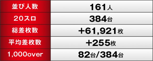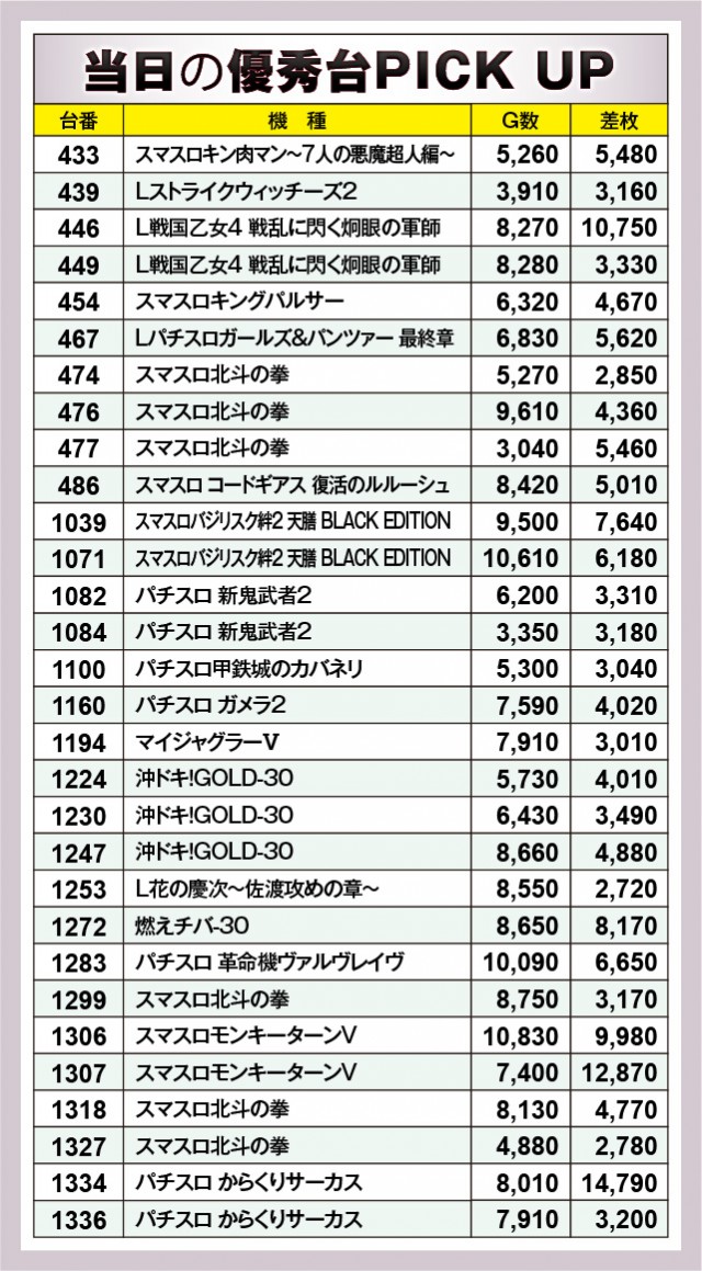 上表をご覧の通り、『L戦国乙女4 戦乱に閃く炯眼の軍師』446番台+10,750枚・『スマスロモンキーターンV』1307番台+12,870枚・『パチスロ からくりサーカス』1334番台+14,790枚と、3台の万枚OVER達成台が生まれた。また万回転OVERを達成する台も確認でき、全体的に8~9千回転台が目立っていることから、相当な手ごたえを掴んでいたのは確かだ。同店の力強さを感じる内容で、ファンもポテンシャルを引き出していたと言える。