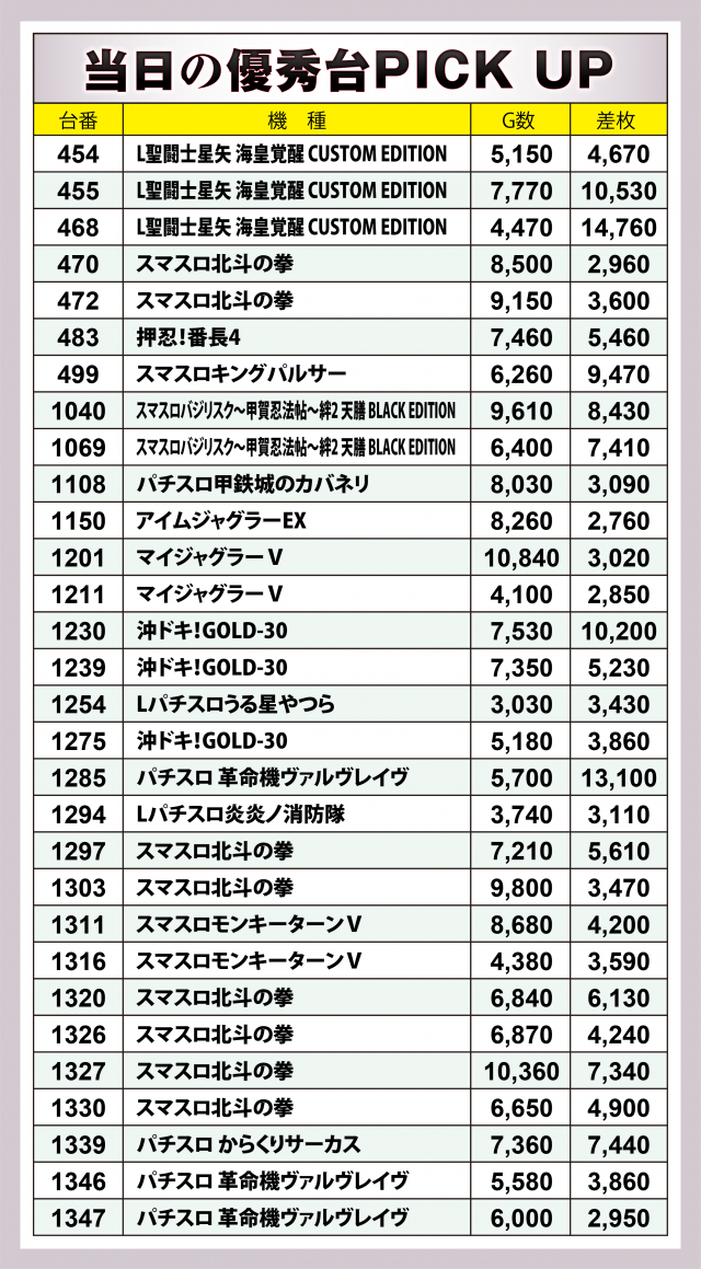 ここからは、入手した出玉データから当日の優秀台を事細かに追っていこう。