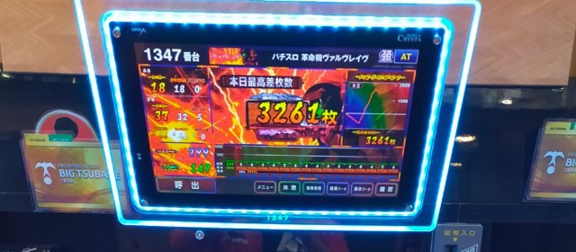 差枚数が多い順から挙げると、『パチスロ 革命機ヴァルヴレイヴ』が+1万4千枚オーバー・+7千5百枚弱・+4千5百枚弱が1台ずつと好調台が連発。次いで『パチスロ からくりサーカス』が+1万枚をクリア、『L戦国乙女4 戦乱に閃く炯眼の軍師』が+9千枚弱、『L聖闘士星矢 海皇覚醒 CUSTOM EDITION』では+7千枚超が2台、『スマスロ北斗の拳』では+5千枚超が5台&10台の合算で+4万6千枚弱、『沖ドキ!GOLD-30』では+8千1百枚弱を筆頭に5台合わせて+2万5千枚弱と、店内のそこかしこにハイスコアが見受けられた。