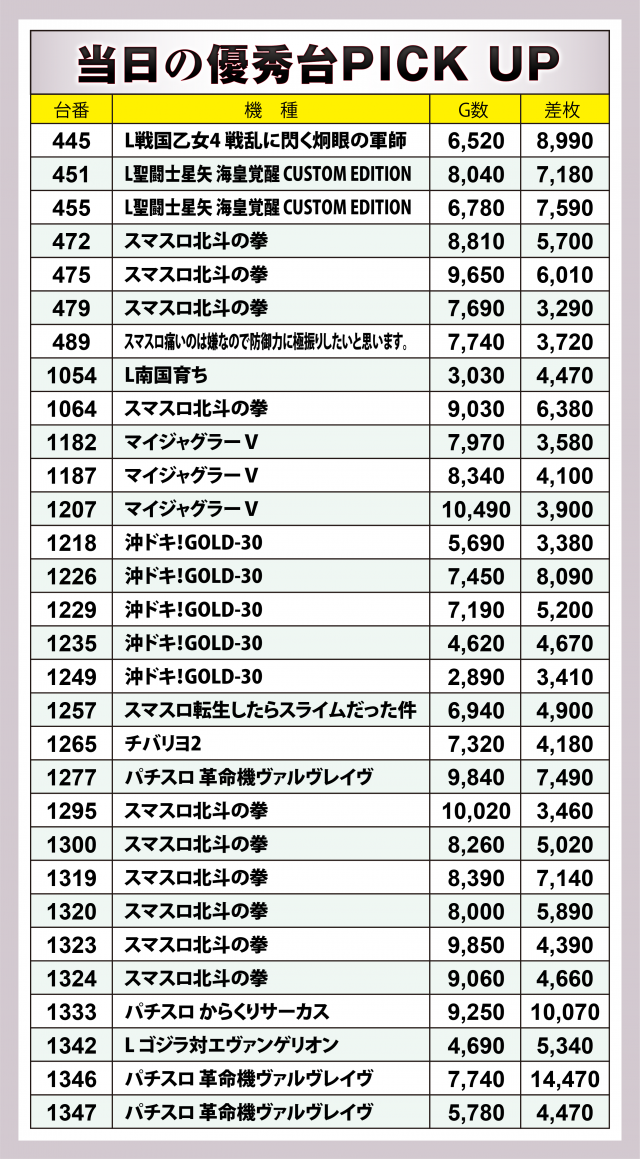 以下、当日の出玉データから優秀台の詳細に迫っていく。