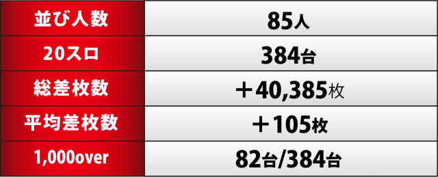 上でも述べた通り、[1000円/47枚]スロ全384台の累計は+40,385枚と、大満足でこの日を終えることができた。
