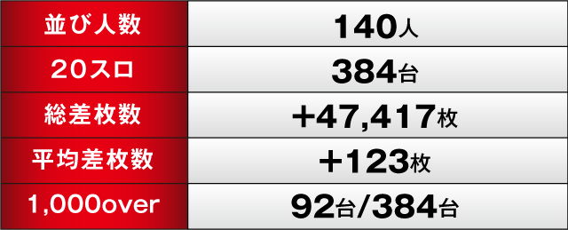 終わってみればトータルの差枚数は+47,417枚を記録。1,000over台も92台/384台をマークしており、文句なしの成績で、連勝を「7」に伸ばした。まだまだ勢いは止まりそうもない。次回も大いに楽しみだ。