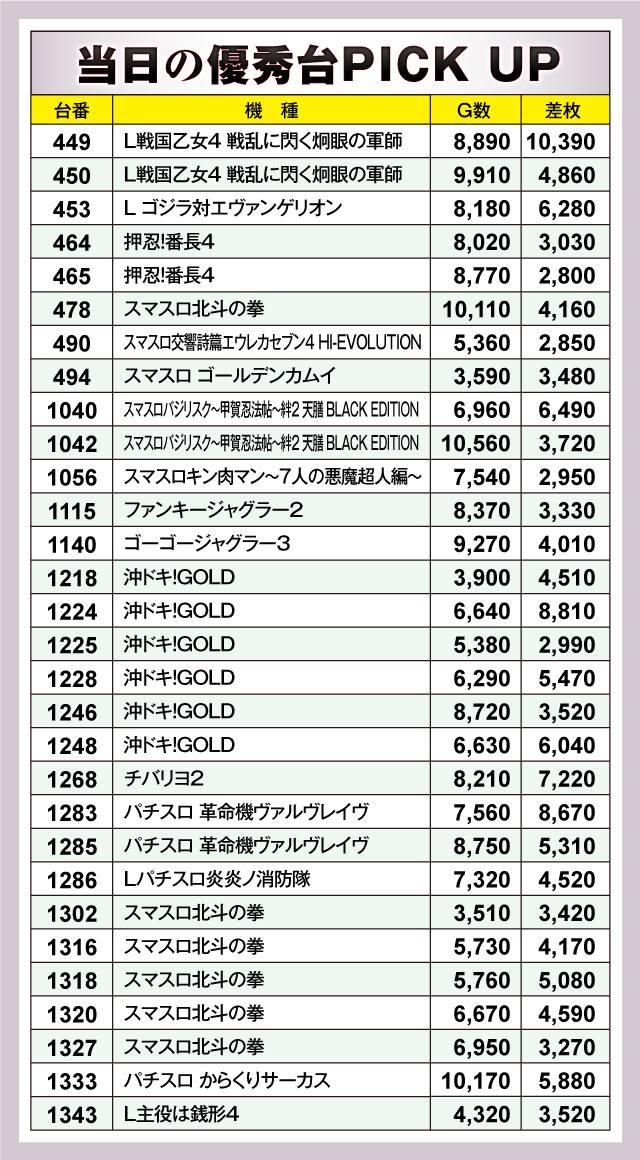優秀台を見てみると、なんといっても大台突破の『L戦国乙女4 戦乱に閃く炯眼の軍師』。449番台が+10,390枚を記録。さらに450番台も+4,860枚と好調。乙女の本気というヤツを見せてもらった。それに続いたのが『沖ドキ!GOLD』。+9,910枚の1224番台を筆頭に、1248番台が+6,040枚、1228番台が+5,420枚、1218番台が+4,510枚と優秀台がズラリ。人気と実力を十分アピールした。負けじと活躍したのが『パチスロ 革命機ヴァルヴレイヴ』。1283番台が+8,670枚、1285番台が+5,310枚をマークした。『チバリヨ2』がそれに続き、1268番台が+7,220枚を記録している。以下、+6,490枚の『スマスロバジリスク~甲賀忍法帖~絆2 天膳 BLACK EDITION』1040番台、+6,280枚の『L ゴジラ対エヴァンゲリオン』453番台、+5,880枚の『パチスロ からくりサーカス』1333番台、+5,080枚の『スマスロ北斗の拳』1318番台などが輝いていた。