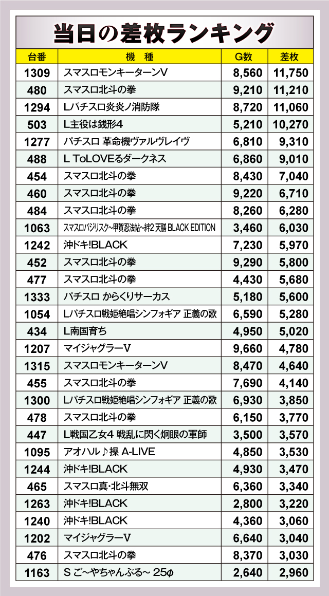 この日はなんと、1309番台『スマスロモンキーターンV』、480番台『スマスロ北斗の拳』、1294番台『Lパチスロ炎炎ノ消防隊』、503番台『L主役は銭形4』の4台が+万枚overを達成! 驚異的な存在感で、周囲は驚きに包まれていた。他にも+万枚まであと一歩となる記録を残す台も多数出現し、ホール内の至るところで膨大な熱量を感じることができた。