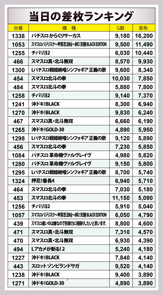 次項で記す機種以外では、『パチスロ からくりサーカス』1338番台が+16,200枚超で全台の王座に就いた他、『スマスロバジリスク~甲賀忍法帖~絆2 天膳 BLACK EDITION』が+11,500枚弱、『チバリヨ2』が+10,400枚超&+7,400枚弱&+5,000枚超が1台ずつと、大台突破がそこかしこに花開いた。
