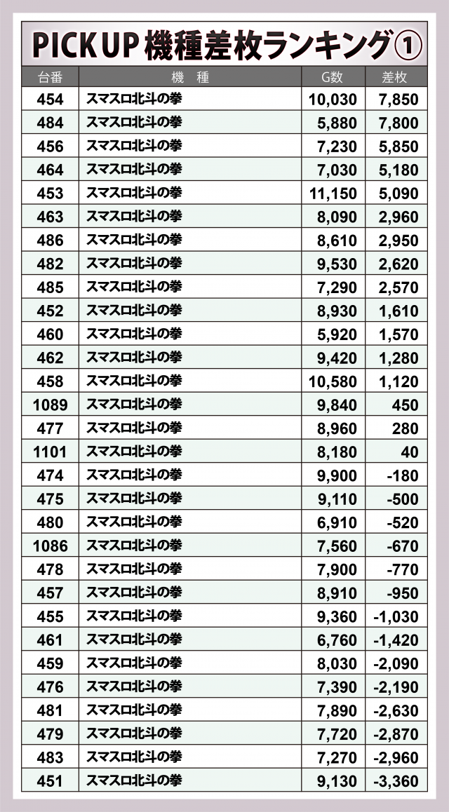最初はこの日の上位30台をチェック。同店ではよく見られる光景だが30台の全てが+3,000枚以上とハイレベルを記録し、+4,000枚以上は全体の9割強となる28台、+5,000枚以上は全体の3分の2強となる21台、+6,000枚オーバーは11台、+7,000枚オーバーは8台、+8,000枚オーバーは5台、+9,000枚オーバーは4台、さらに万枚をクリアしたのは3台と、過去回に引けを取らない高水準を保った。
