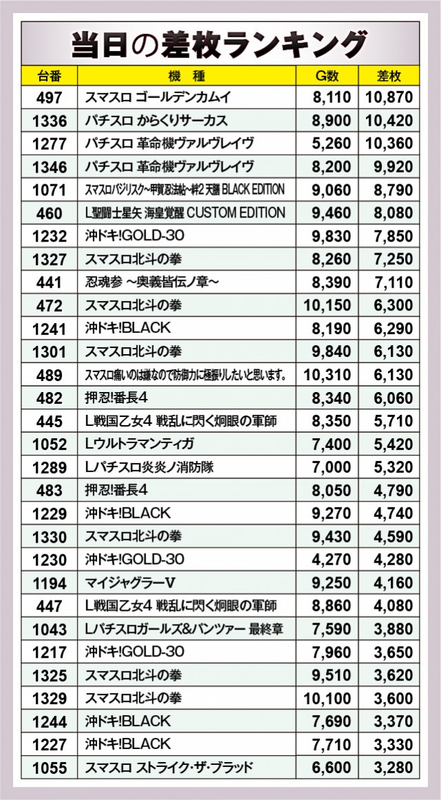 『スマスロ ゴールデンカムイ』『パチスロ からくりサーカス』『パチスロ 革命機ヴァルヴレイヴ』から万枚OVERが飛び出しており、ほかにも7,000枚OVERを達成した台が多い。もっと言えば、上表に取り上げた機種は3,000枚OVERからとなっているため、店内は凄まじい熱気に包まれていたことが分かる。万回転OVERをはじめ、終日打ち込まれた台の多さからも、充実した状況だったのは間違いない。