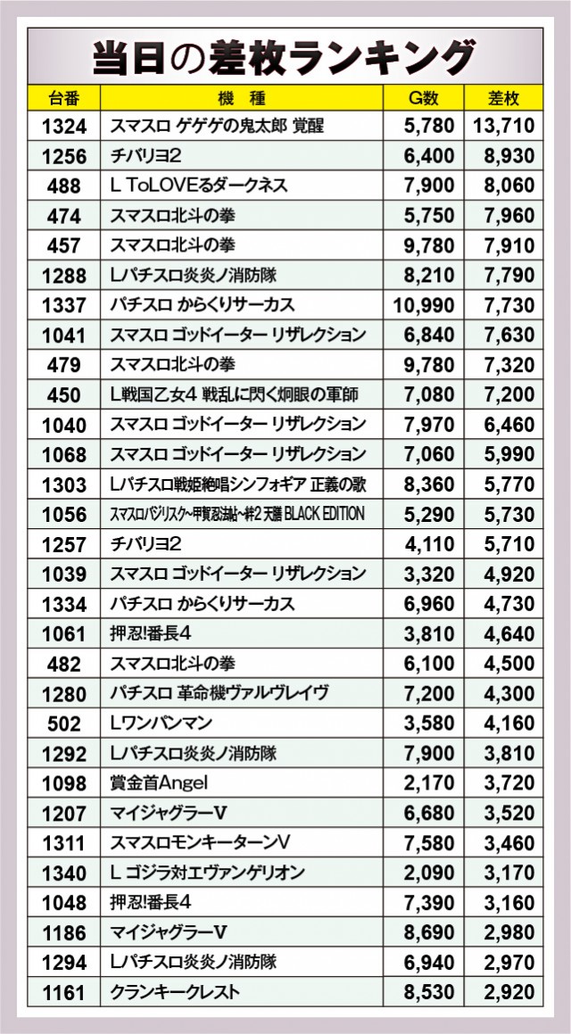 当日は当然のように万枚OVERが発生し、『スマスロ ゲゲゲの鬼太郎 覚醒』は盛り上げ役として活躍していた様子だ。このほかにも『チバリヨ2』『L ToLOVEるダークネス』といった高い性能を持つ台から8,000枚OVERが生まれており、全体を見ても15台が5,000枚を達成していることから、相当な熱気に包まれていたのが分かる。『パチスロ からくりサーカス』では万回転OVERも確認でき、ファンはレバーを楽しく叩けていたようだ。