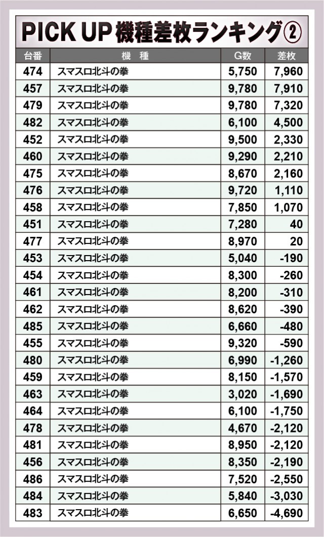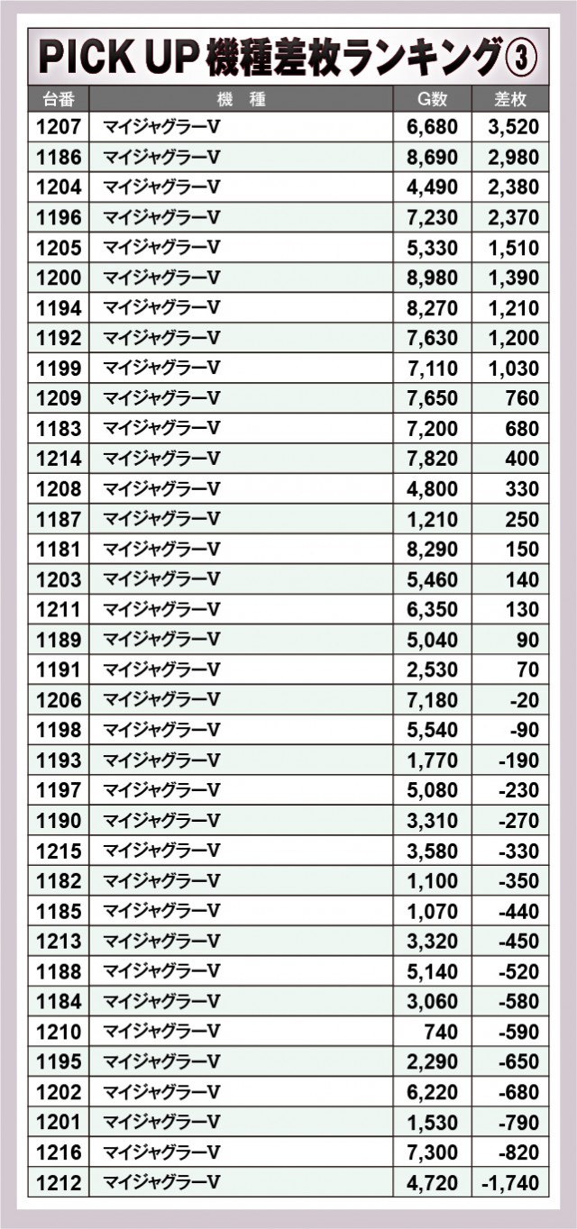 『スマスロ ゴッドイーター リザレクション』『スマスロ北斗の拳』は活気と熱気の中心となり、やはり盛り上がりを牽引する存在となっていた。両機種から4台の7,000枚OVERが確認でき、大きなポテンシャルを持っていたのは間違いない。また『マイジャグラーⅤ』も回転数と差枚数が比例する展開を披露しており、大きなマイナスがあまり見られないのは、相応に可能性を秘めていたということだろう。