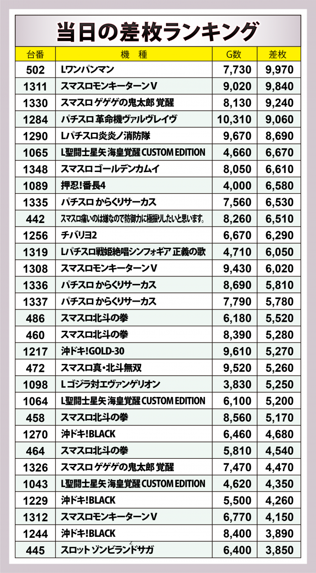 最初はベスト30台の成績をチェック。同店では珍しくない事例だが30台の全てが+3,000枚以上を成し遂げ、+4,000枚以上は全体の9割超となる28台、+5,000枚以上は全体の7割超となる22台、+6,000枚オーバーは13台、+8,000枚オーバーは5台、そして+9,000枚オーバーは4台と、プラス5桁の台こそないものの、上位陣のレベルはかなり高かった。