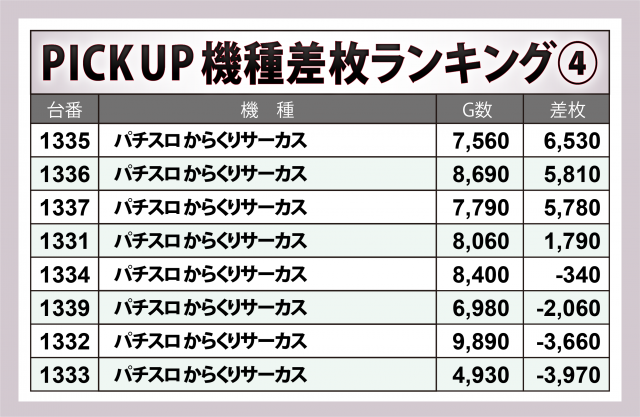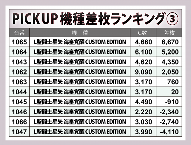 差枚数順に追っていくと、『Lパチスロ炎炎ノ消防隊』では+8,700枚弱、『L聖闘士星矢 海皇覚醒 CUSTOM EDITION』では+6,700枚弱・+5,200枚超・+4,400枚弱が1台ずつ、『パチスロ からくりサーカス』では+6,500枚超・+5,800枚超・+5,800枚弱が1台ずつと、ここまで紹介した台と競り合う内容を見せた。
