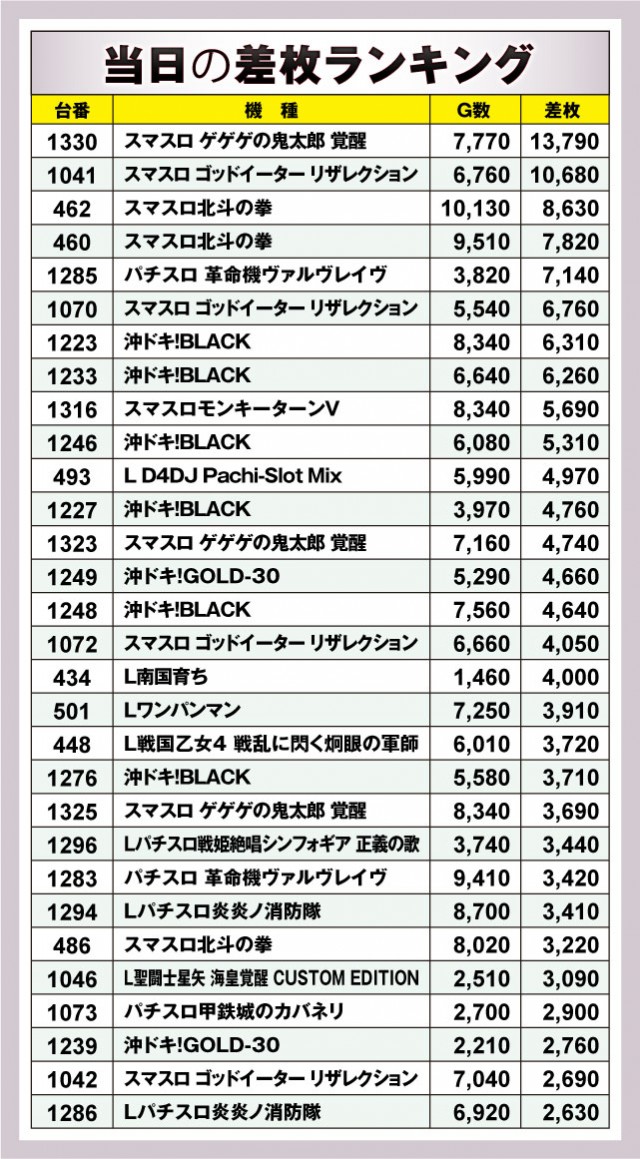 今回は特に新台の動向が良かったので、新台中心でご紹介してきたが、やはり人気機種も見逃せない差枚数となっている台番もある。