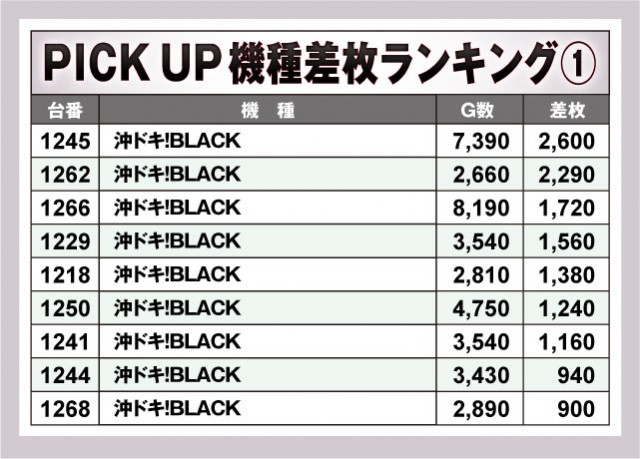 そして、差枚数ランキングの中でもかなりの台数がノミネートされていたのがこの『沖ドキ!BLACK』だ。上表においてはランキング以外でプラス差枚数となった台番が記載されている。